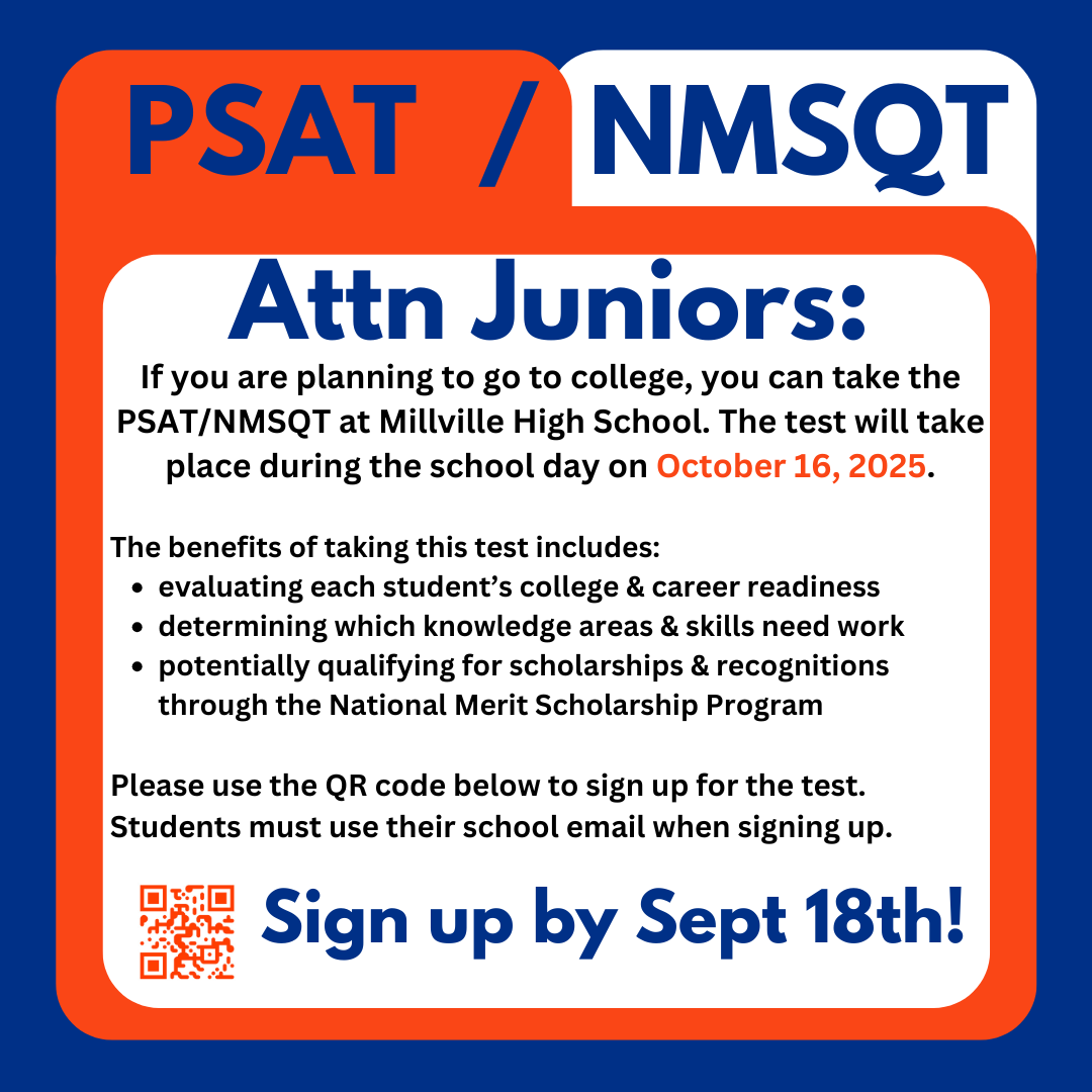PSAT (October 16, 2025) Attention Students Millville High School will host the PSAT-NMSQT on October 16, 2025. Please use the link or QR code to sign up for the test by September 18th! 🔗 CLICK HERE TO REGISTER