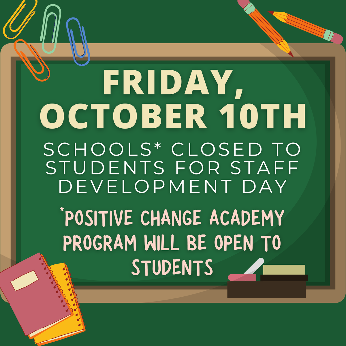 - Wednesday, October 15, 2025: Positive Change Academy ONLY will be closed to students for a Staff Development Day